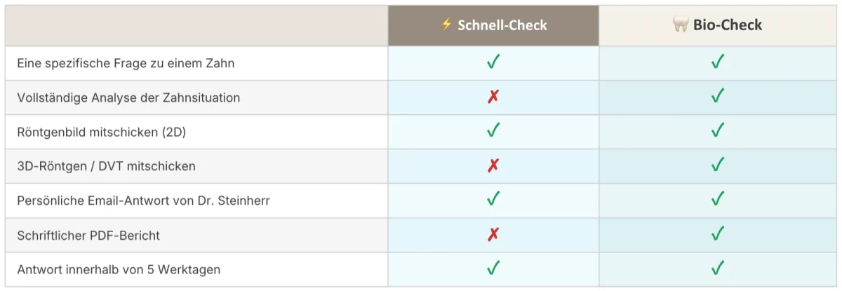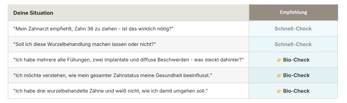 Die einfachste Faustregel: Hast du eine einzelne, klar formulierbare Frage zu einem bestimmten Zahn – dann ist der Schnell-Check das Richtige. Geht es um mehr als einen Zahn, um dein allgemeines Wohlbefinden im Zusammenhang mit deinen Zähnen, oder um eine Situation die du selbst kaum in einem Satz beschreiben kannst – dann ist der Bio-Check die richtige Wahl.